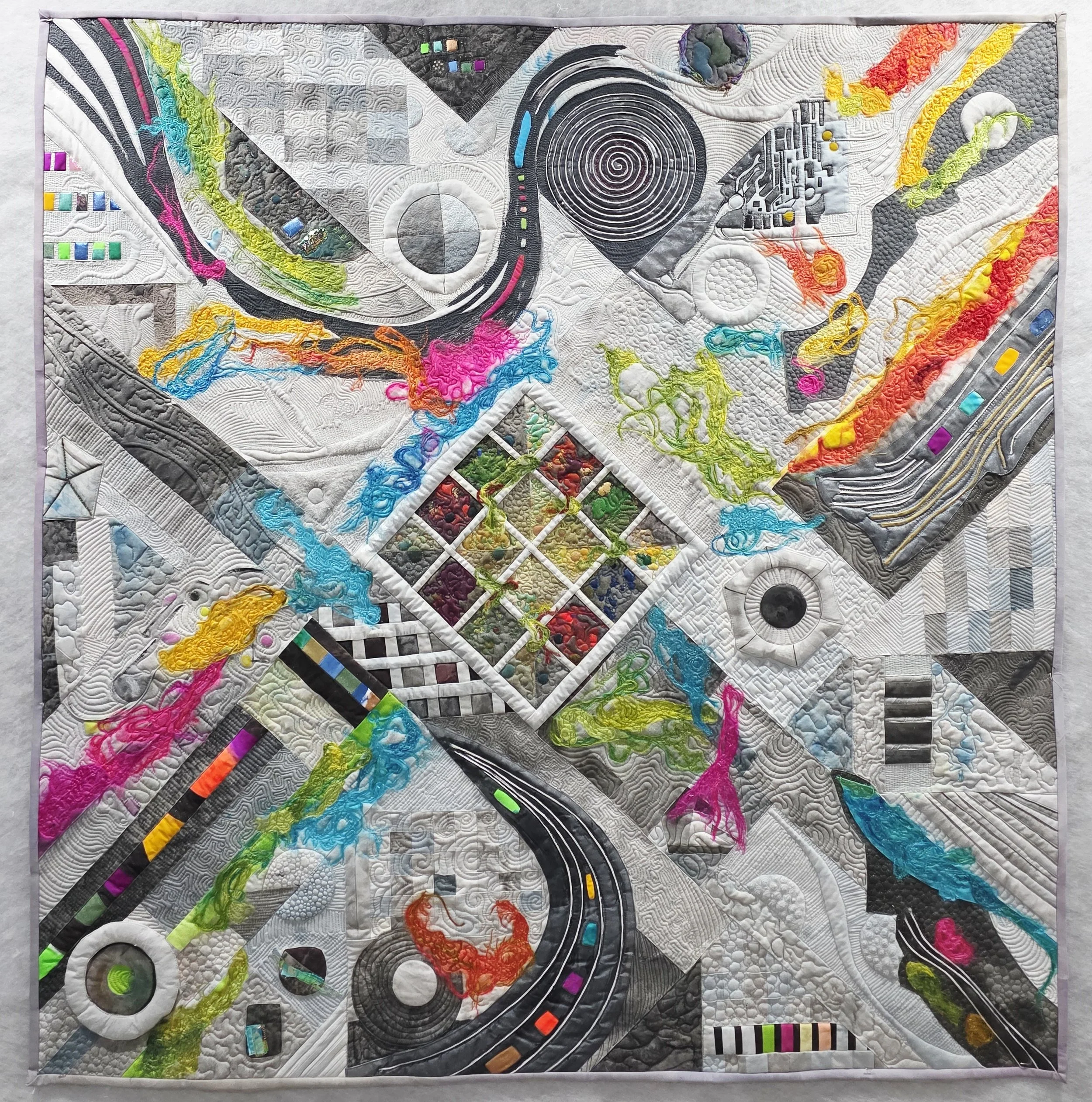 Marisa Marquez, Stitched Syntax, 2025. Cotton fabric, blend batting, fabric paint, polyester thread, silk and wool fiber, Angelina.